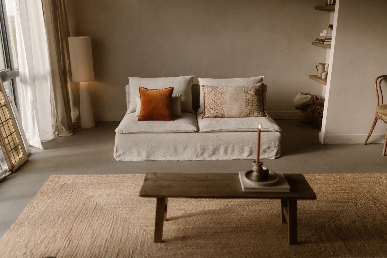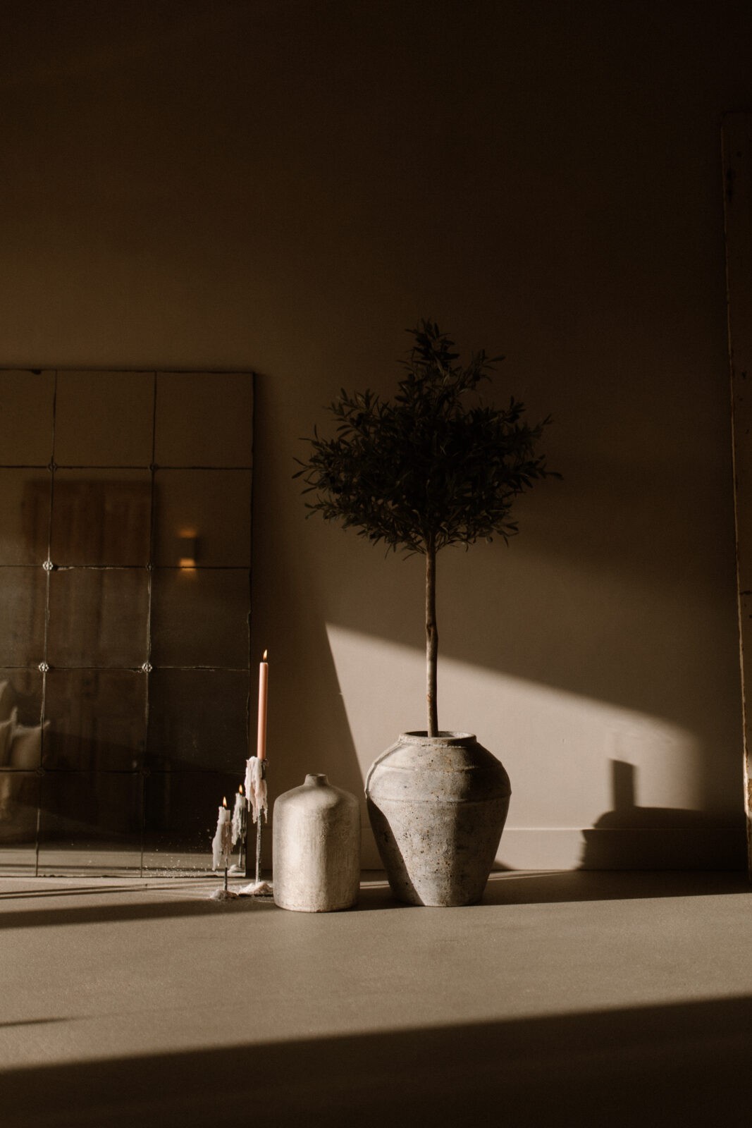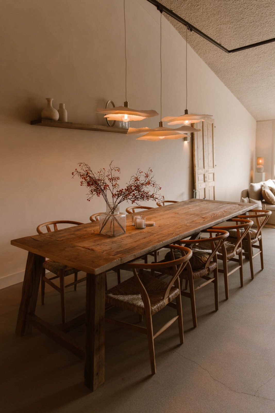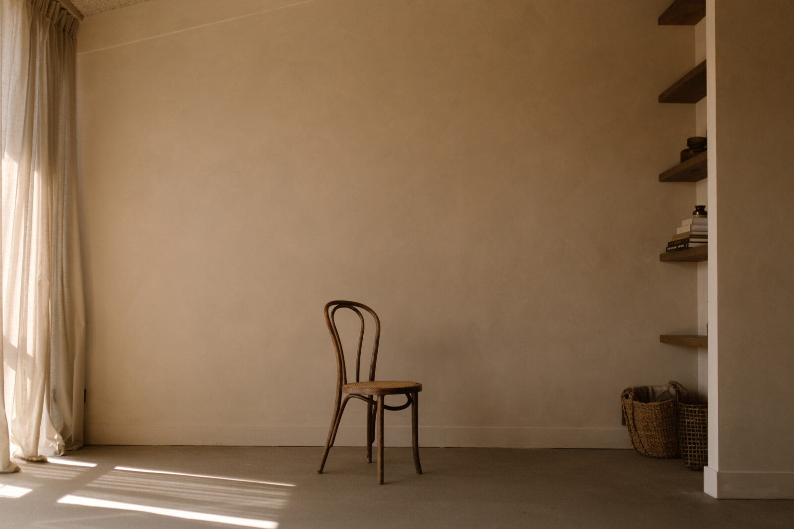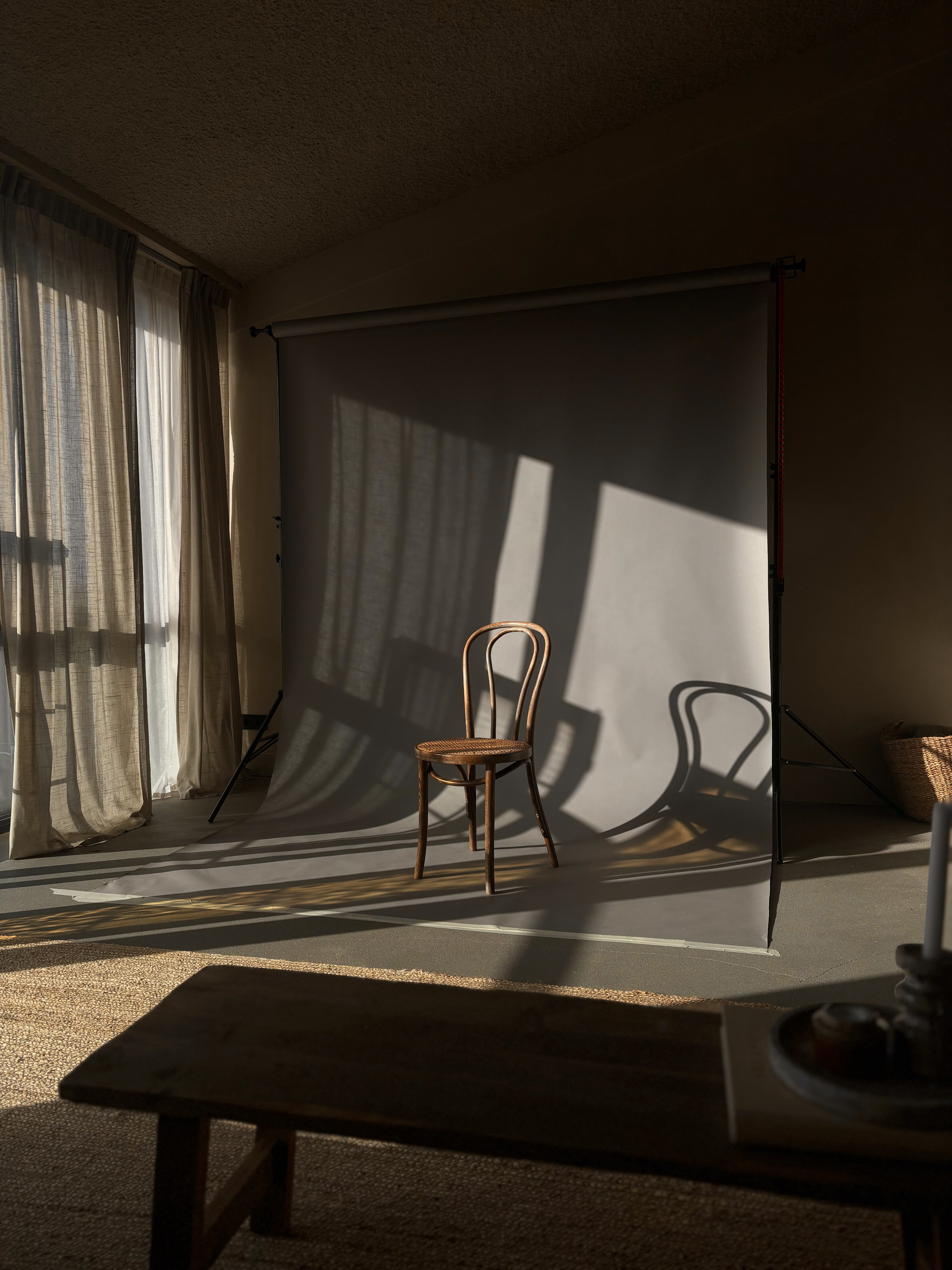 De neutrale en warme inrichting van de studio zorgt voor een rustige, uitnodigende sfeer die de aandacht volledig op het onderwerp houdt. Het zachte, natuurlijke licht in combinatie met de warme tinten van de studio creëert een prettige omgeving, ideaal voor verschillende soorten fotografie, van mode tot productfoto’s.